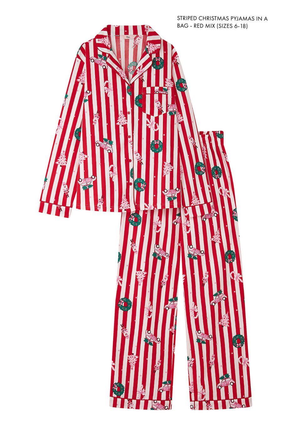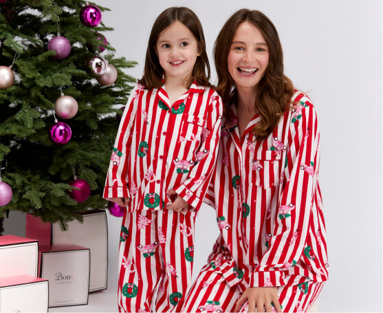 Spending the night working your way through your favourite festive films with the family is the perfect excuse to be wearing matching family pyjamas. Go big with the festive theme with Christmas Scene Pyjamas in a Bag, with matching kids pyjamas also available. The pyjamas come in a festive red with contrasting pink piping and of course the most idyllic Christmas scene you have seen - with wreaths, nutcrackers, festive pink cars, Christmas trees and more.