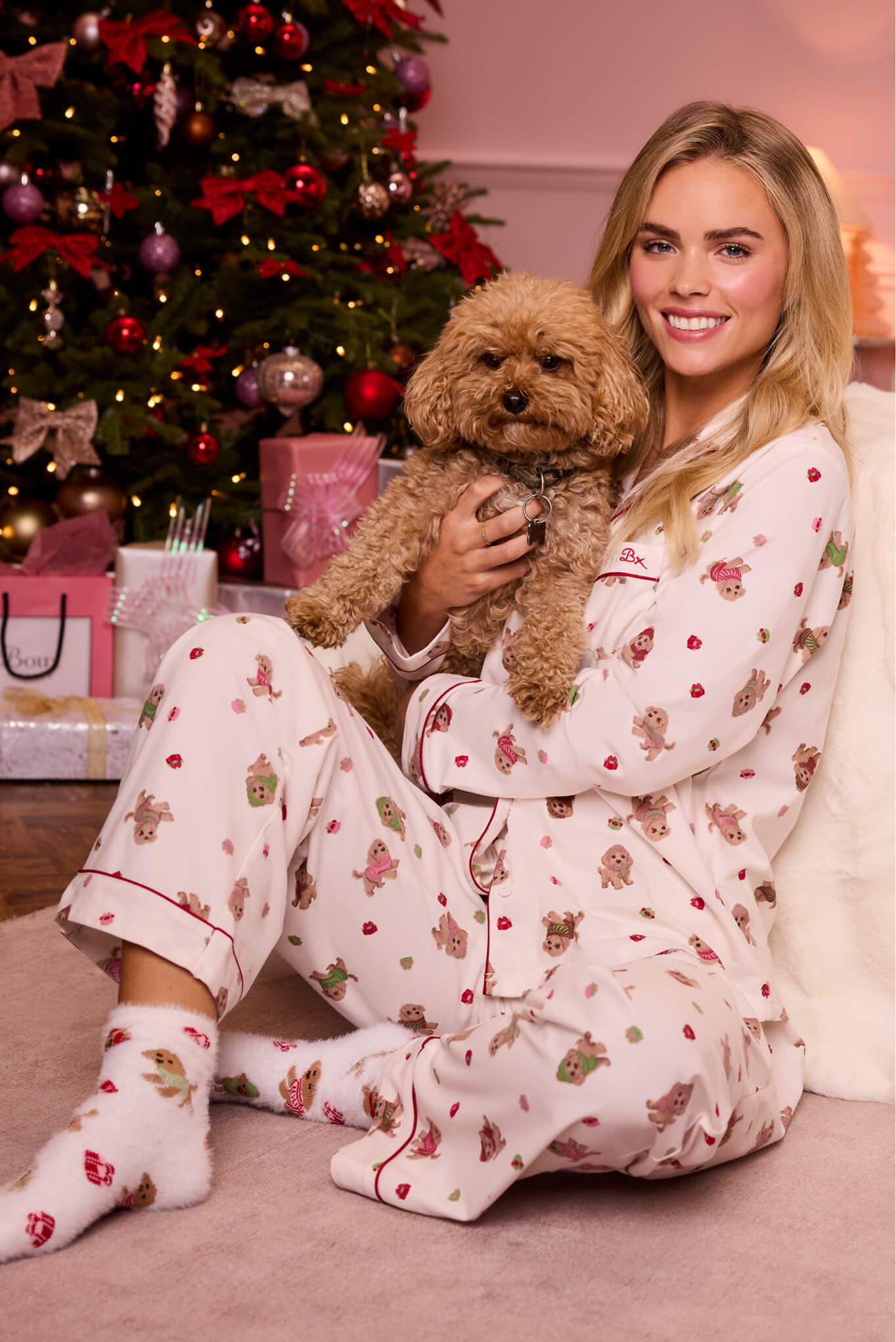 Our fleece pyjamas made with super soft fleece offers the ultimate cosy experience. The Cockapoo Pyjamas in a Bag, feature a playful print of cockapoos all wrapped up in their Winter warmers - knitted hats, jumpers and scarves - a truly adorable nightwear set. Don’t forget to complete the look with the cute matching Fluffy Cockapoo Ankle Socks.