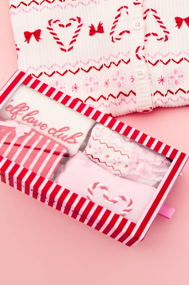 4 Pack Christmas Thong Gift Box - we all know the golden rule when packing - you can never pack too many knickers. Stock up her collection with these fun festive thongs featuring nutcrackers, candy canes and more. Whilst beautifully presented in a giftable candy cane striped inspired box.