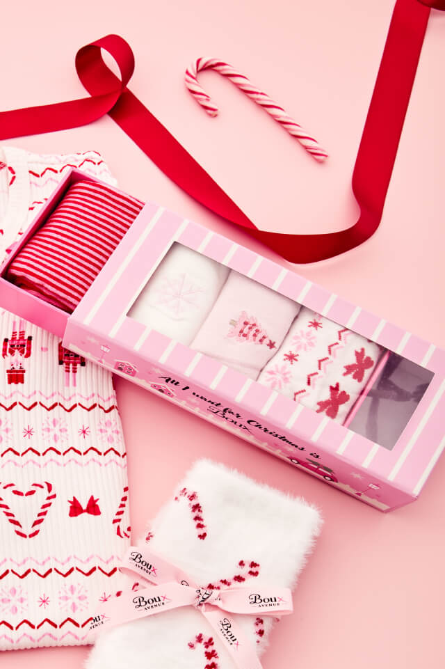 4 Pack Christmas Sock Gift Box - providing all the festive joy these festive socks offer a Winter wonderland scenery, with fairisle designs, snowflakes, pink Christmas trees and more. Beautifully presented in a Christmas scene gifting box.