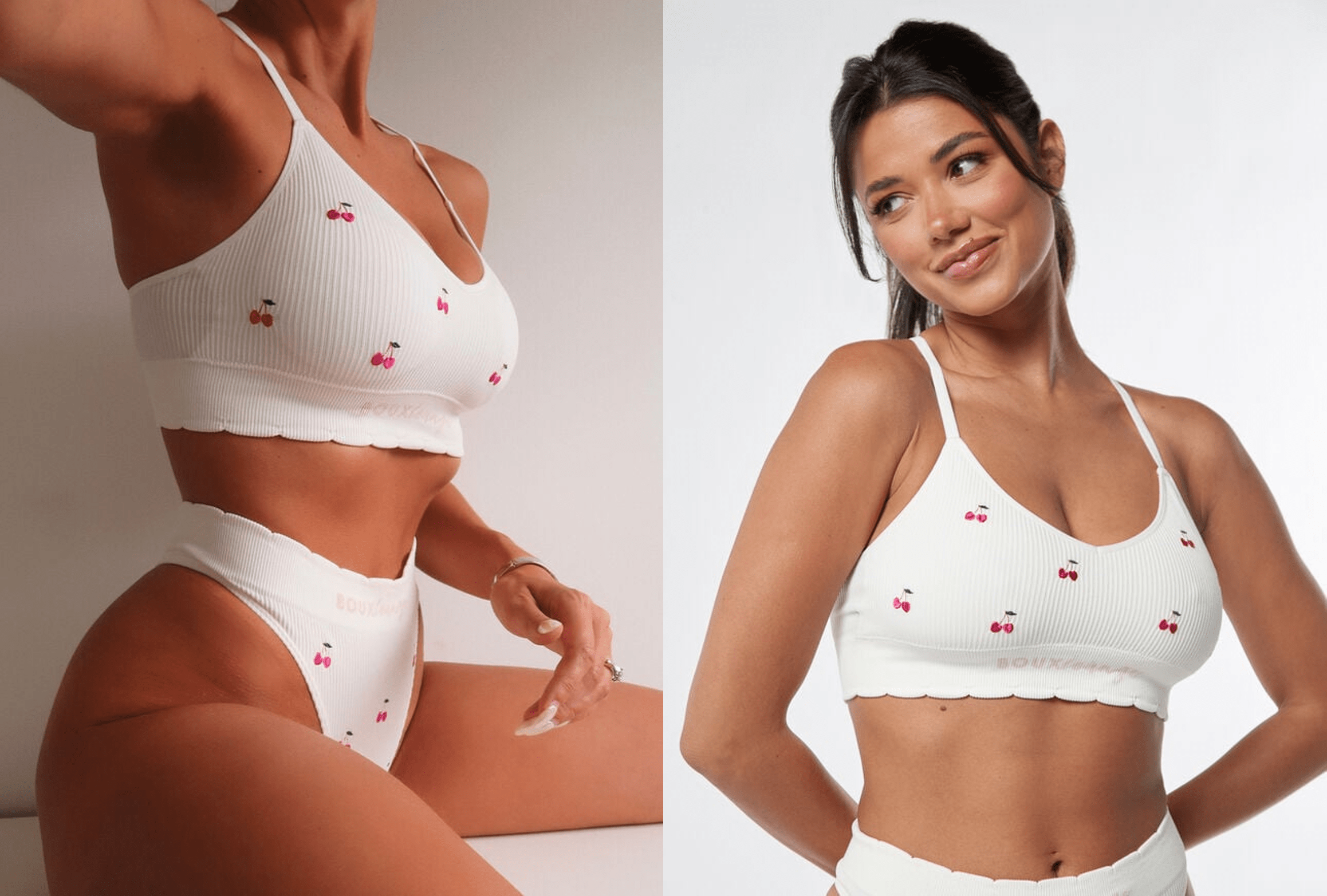 If you want to channel summer’s warmth into your winter outfits, then start from the base (layer) up with the cheery-cherry Ribbed seamless cherry embroidered bralette. This one has a sporty feel thanks to a cross back and adjustable straps, while the scallop edging on the underband is both comfy and feminine. Match it with the complementary cherry red Chevron ribbed seamless thong.