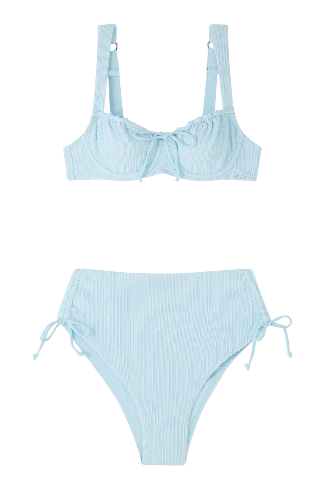 The Amalfi Balconette Bikini Top is a great place to start. Its textured crinkle fabric shapes the bust naturally, giving soft definition without padding. The balconette cut offers a flattering fit with underwired support, while wide adjustable straps make it comfortable all day. A ruched neckline and adjustable tie at the front add a pretty, feminine finish. It’s easy to see why this is one of our bestselling bikini tops.