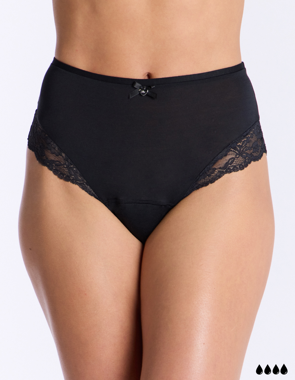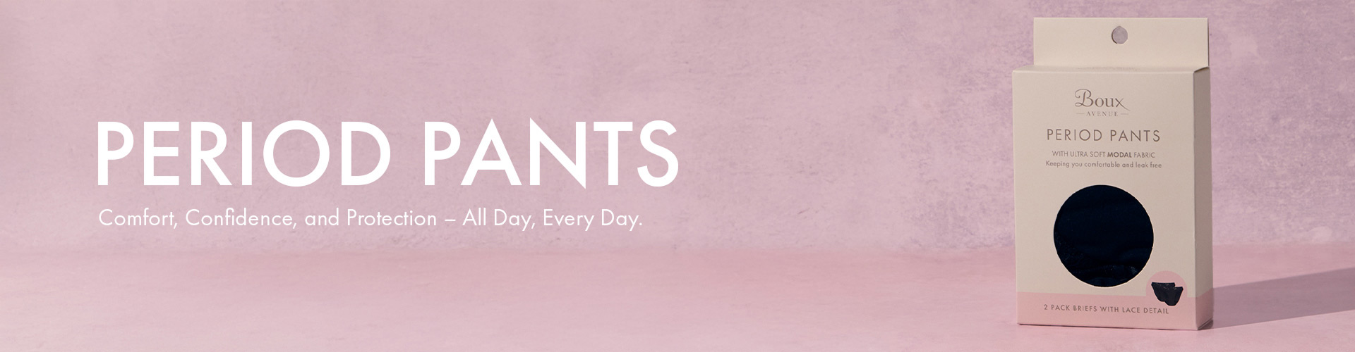 Our period pants are available in 2 levels of absorbency. Medium Flow is for a period that would typically use 3 regular tampons a day. Heavy Flow is for a period that would use 4 regular tampons a day. Designed to work with you whatever your shape, choose from two comfy designs.