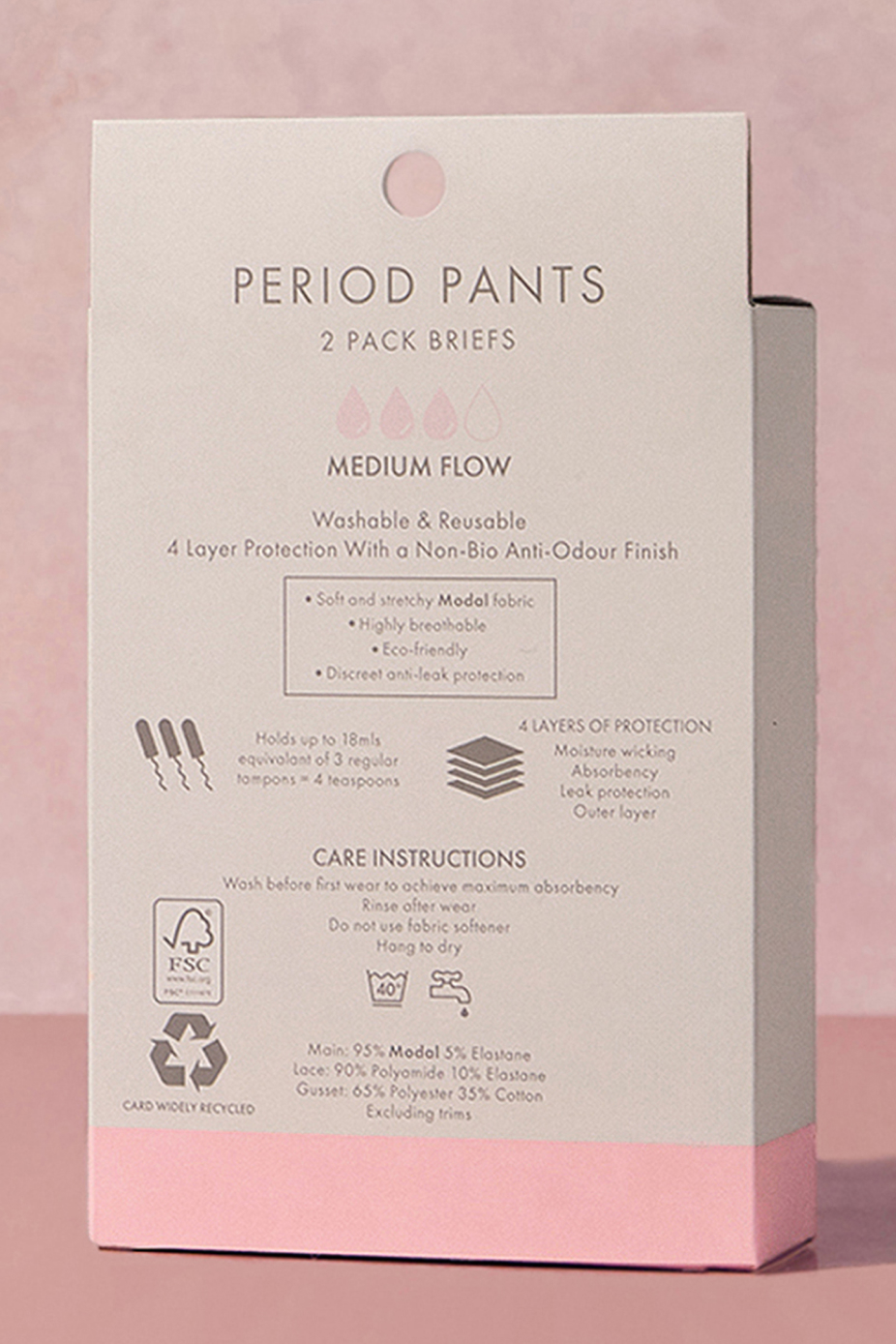 - Two styles to choose from: Medium Flow (black with a lace trim) and Heavy Flow (high-waisted black with lace trim).