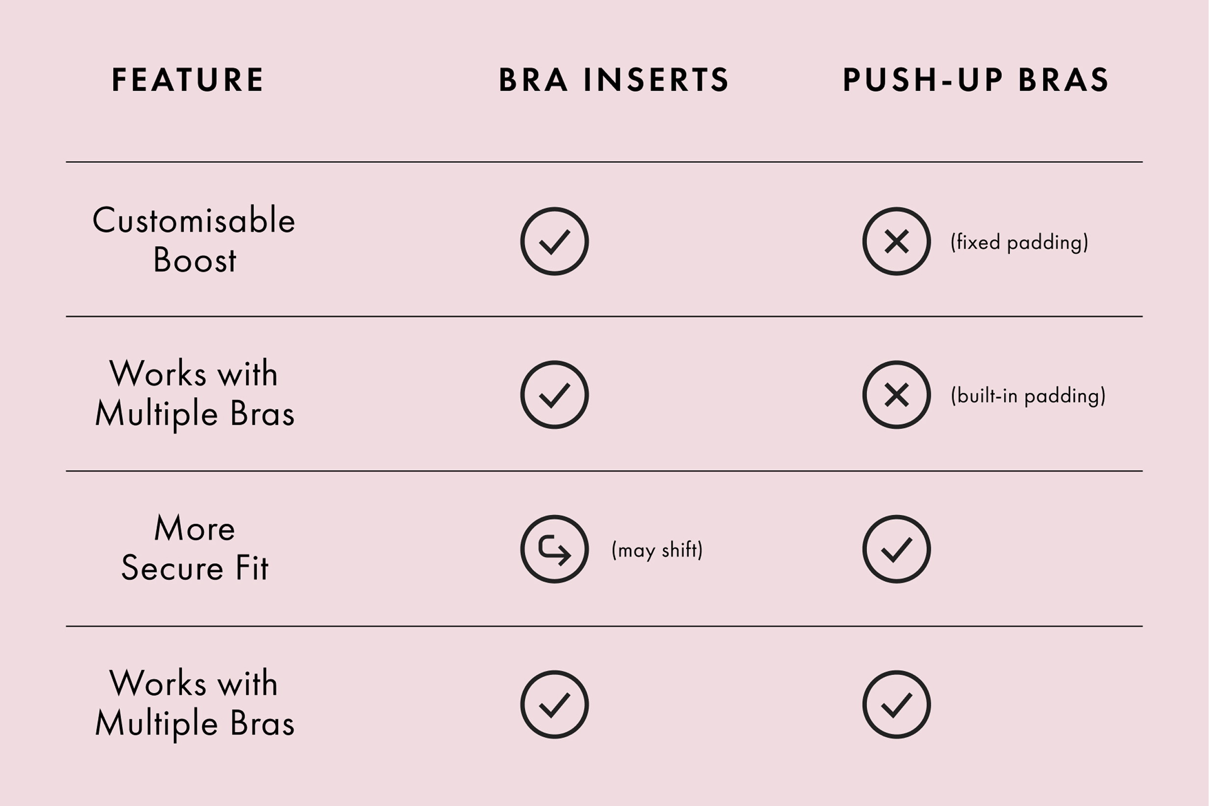 There are plenty of reasons to give bra inserts a go, and it’s not just about giving the illusion of a bigger bust. Bra inserts are made to enhance your natural shape, not to hide it, and they are accessible for a variety of breast sizes. Maybe you want a little extra lift to feel your best in a date-night dress, or you're looking to even things out after surgery, or if your shape’s naturally a bit asymmetrical.