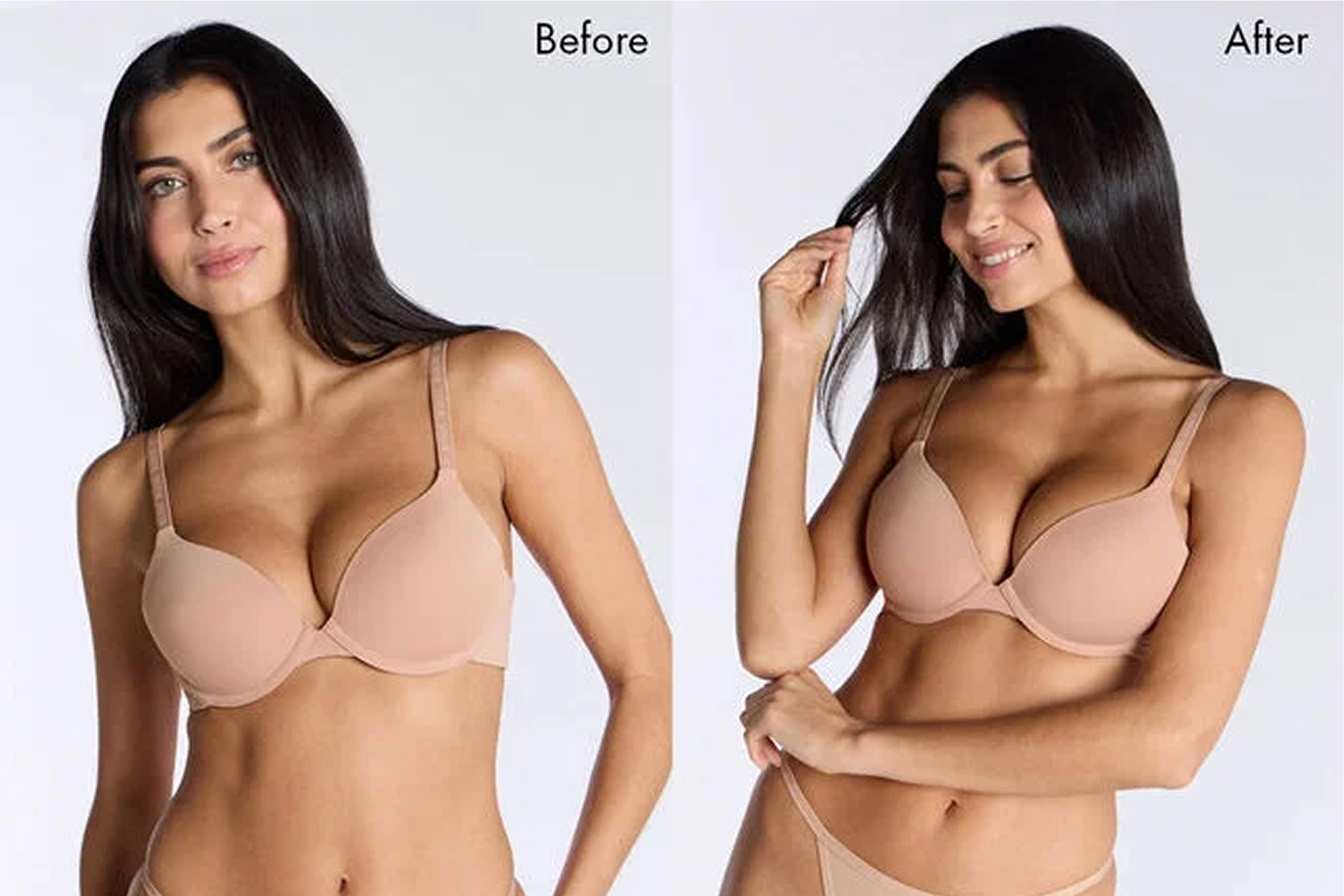 If you’d prefer not to use separate inserts, push-up bras, or even extreme push-up bras, offer a fuss-free solution with built-in padding for instant results. From gentle lift to full-on bombshell, we’ve got something for everyone: Our Push-Up Microfibre Plunge T-Shirt Bra offers a smooth shape with a medium boost and is perfect for everyday wear, and they pair perfectly with the Kaylee Ultra Light Microfibre Stretchy Shorts which our customers love for their comfort, style, and all day wearability.