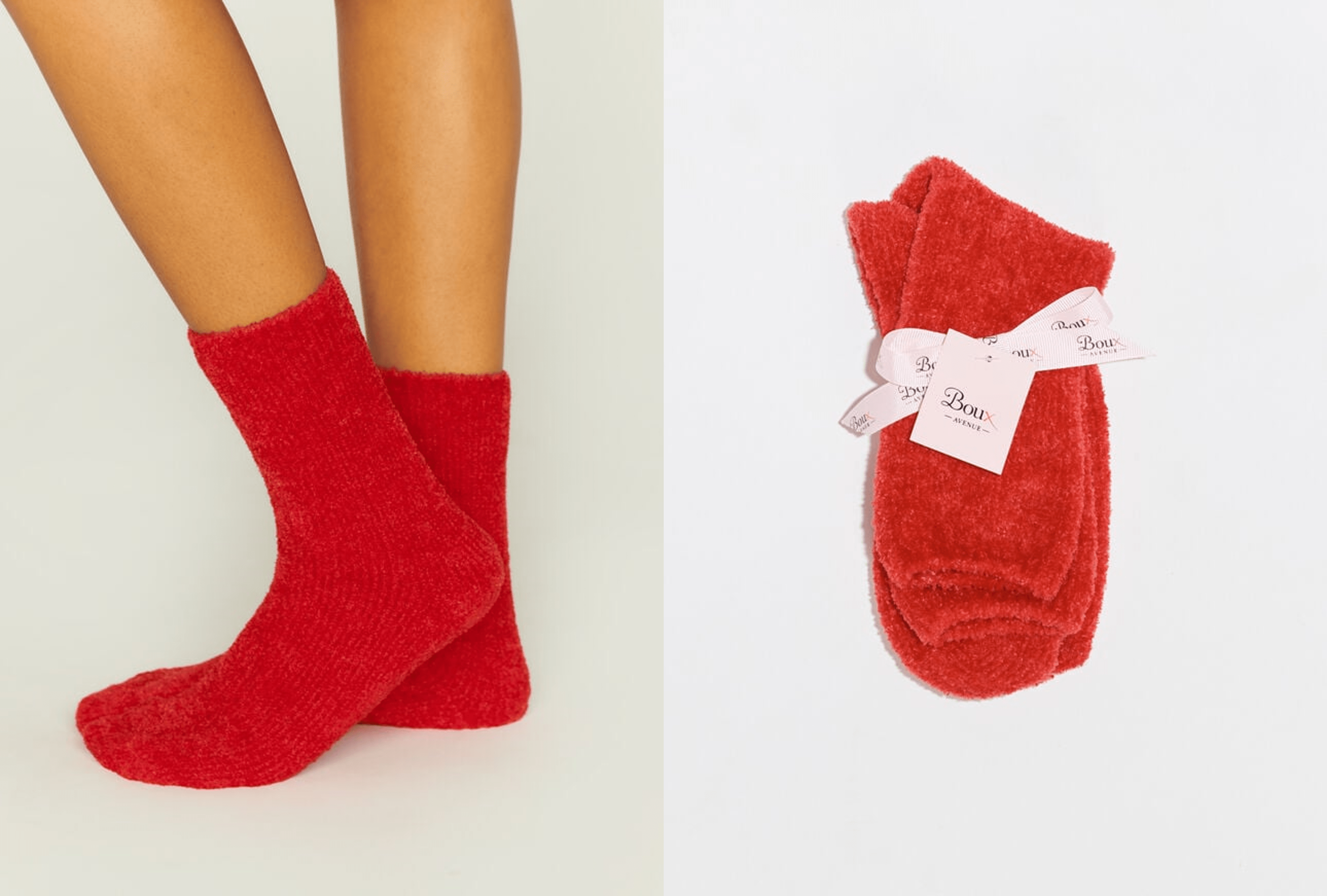 If traditional knitwear is what inspires your winter ‘fits year in and year out, then you’ll appreciate this year’s embroidered update: the Heart embroidered knitted cardigan. From the feminine balloon sleeves, heart-shaped buttons and ribbed detail (all in festive red), this is the one layer that will amplify your Christmas spirit in a heartbeat. We love every piece in the set - including the Heart embroidered knitted bralette and Heart embroidered knitted shorts - and we can’t resist keeping our toes every bit as happy in these red Velvet fleece socks.
