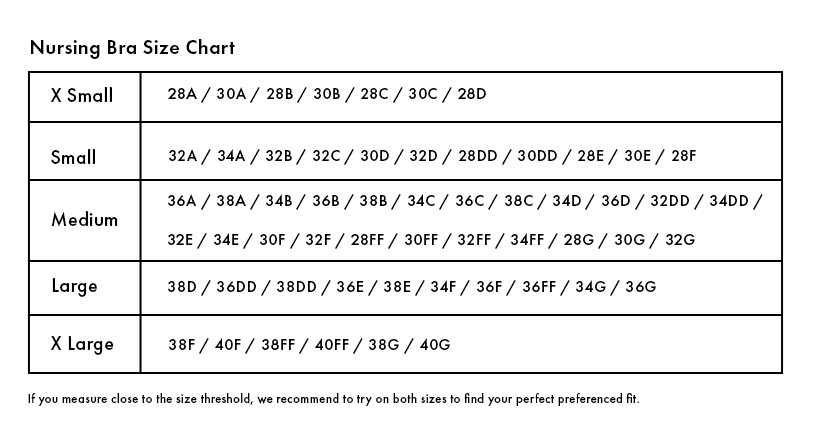 Use the chart below to help you choose which size nursing bra will be best for your bust size. Each size can accommodate a range of bra sizes allowing you to be able to get plenty of wear out of your chosen bralette, even as your breast size fluctuates post-partum.